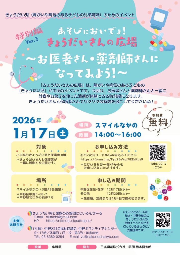 ●対象 きょうだい児(主に小中高生)と保護者 先着8組 *中野区優先あり